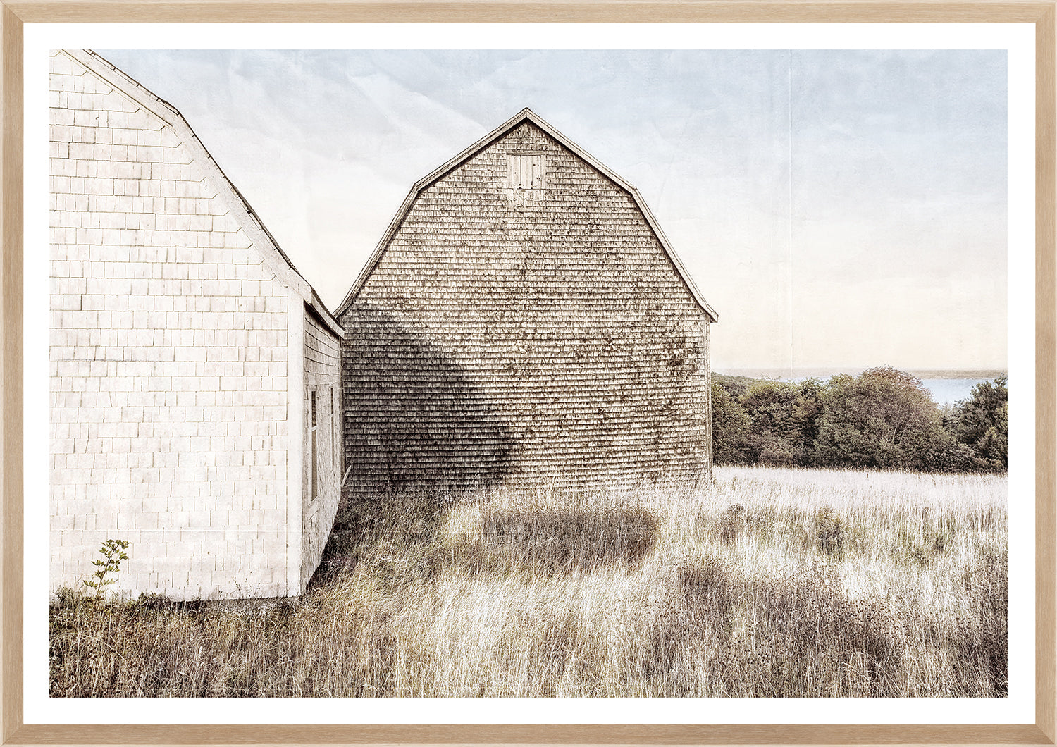 Maritime View captures the nostalgic charm of a weathered farmhouse rendered in soothing blues, creams, and muted browns. The creased paper texture and soft, faded palette evoke a dreamlike quality that transports you to a simpler time. Perfect for adding vintage character and warmth to any room, this piece brings timeless coastal appeal and understated elegance to your space. A conversation starter that celebrates the beauty of imperfection and memory.