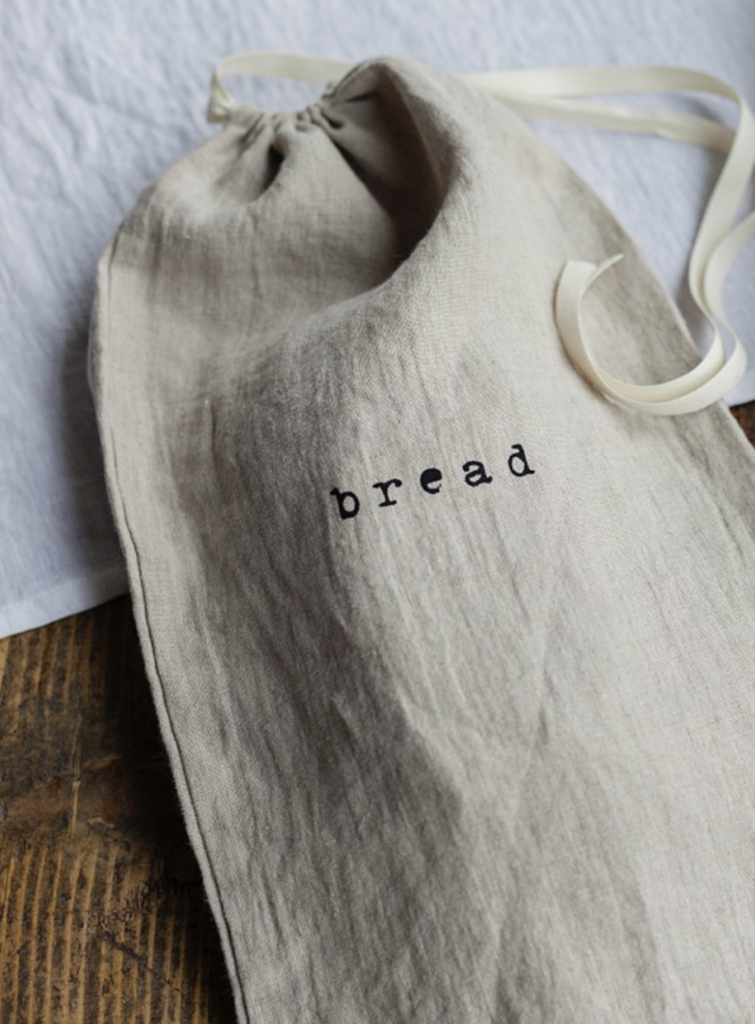 Drawstring linen bread bag in natural linen color (oatmeal). Features a "bread" logo that is screen printed using water-based ink. The ultimate hack to keeping your bread fresh for longer. Linen bread bags are breathable and moisture-wicking so they won’t let your bread go stale or accumulate mold.