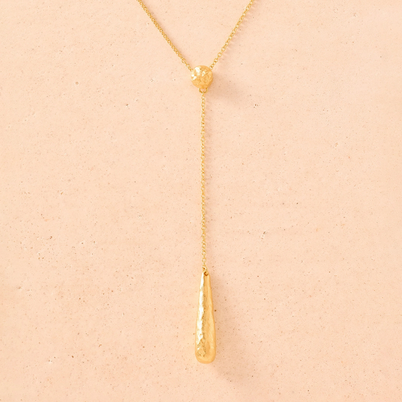 The Stillà lariat sliding necklace reveals a long, hammered drop pendant on a slim chain. Designed for fluidity and movement, a golden nugget shapes the Y and creates the sliding effect.