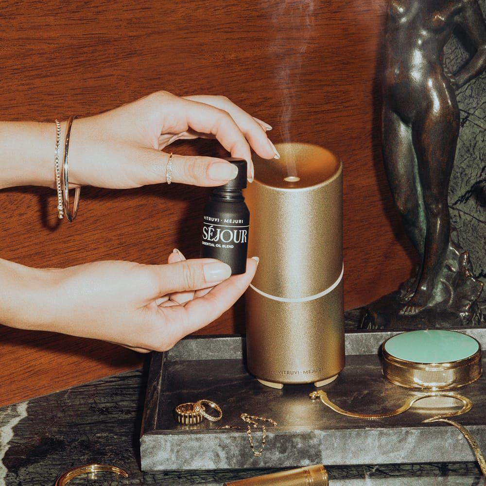 Séjour is earthy and indulgent. With top notes of Bergamot and Geranium and bottom notes of Vetiver, Vanilla, and Frankincense, it smells like gold earrings and a good book.