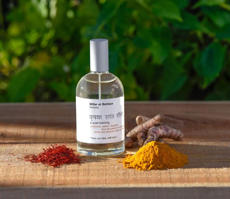 Miller et Bertaux Eau de Parfum | A Quiet Morning evokes the serene calm of Indian dawns. Featuring warm curcuma, exotic saffron, and comforting basmati, complemented by delicate palm and orange tree blossoms, this fragrance rests on a soothing foundation of Indian sandalwood and Tibetan cedar. It invites you to experience tranquility and timeless elegance with every wear.
