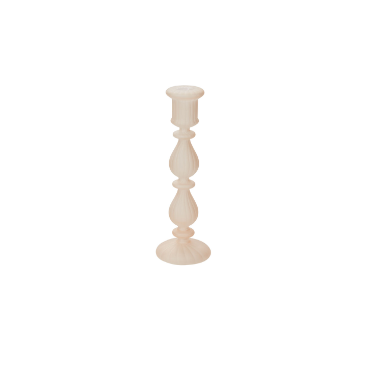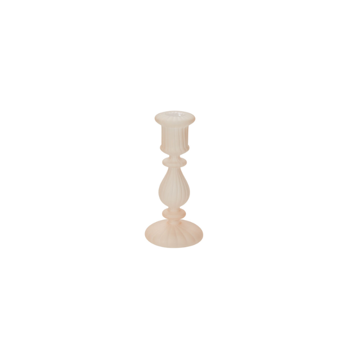Create a trendsetting centerpiece with the small pale pink Encanto Candlestick. Made from very lightweight, delicate, handmade borosilicate glass with a matte pink frosted finish, this neutral-toned candlestick is delicate & chic for home decor or wedding & event design.