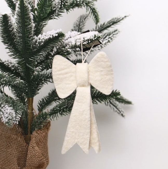Crafted from 100% felted wool and handmade in Nepal, this adorable white bow ornament is the perfect addition to your Christmas decor. Its cute and simple design adds a touch of charm to any tree.